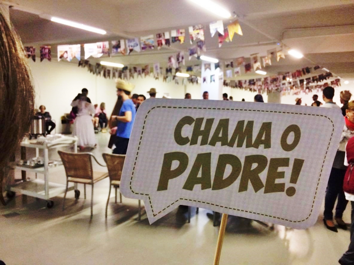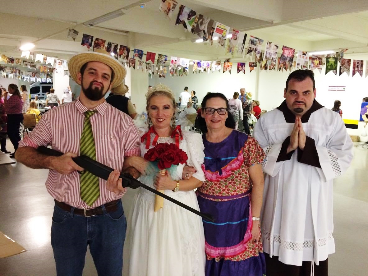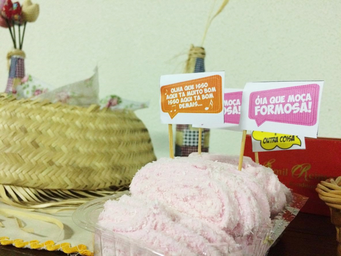 Tem casamento caipira, moça bonita de vestido de chita, canjica, pé de moleque e quentão.